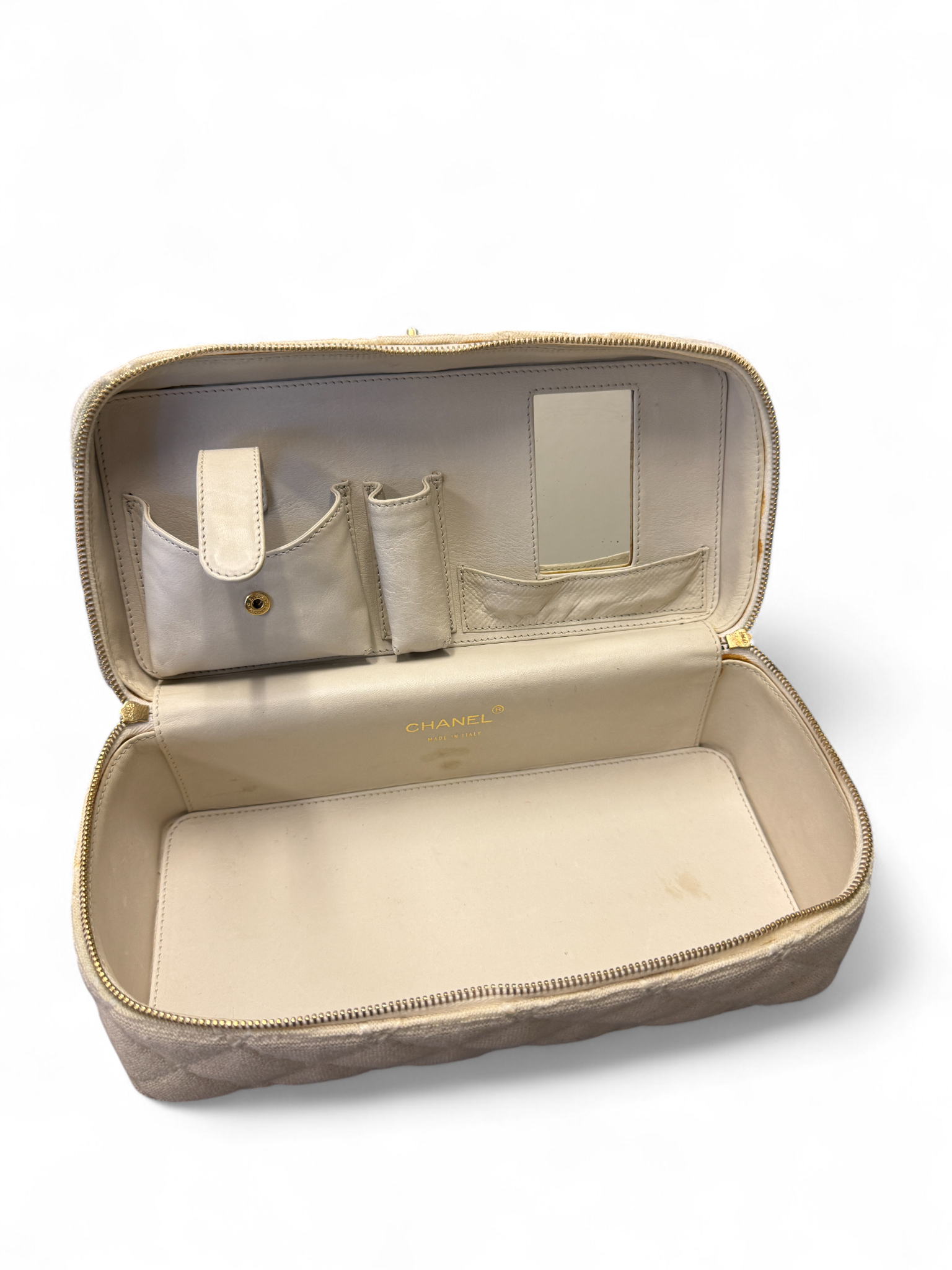 Hard to find, this vintage Chanel Wild Stitch vanity bag is the perfect addition to any collection. Canvas exterior and leather interior this Y2K vintage piece can hold all your needs for travel or on the go. The discontinued Wild Stitch is a beautiful detail. Please see last three pictures as they show some small knicks in the canvas. One is at the bottom panel and the other two in the back. 24K gold tone hardware is in good condition. Leather interior is clean, with a holder for lipstick and compact. This is a 7 series.
