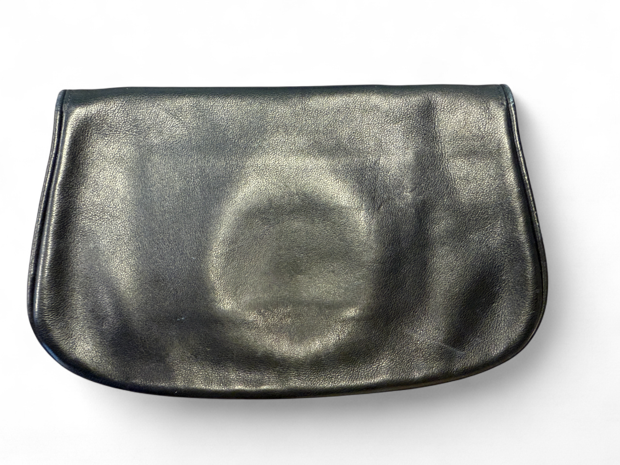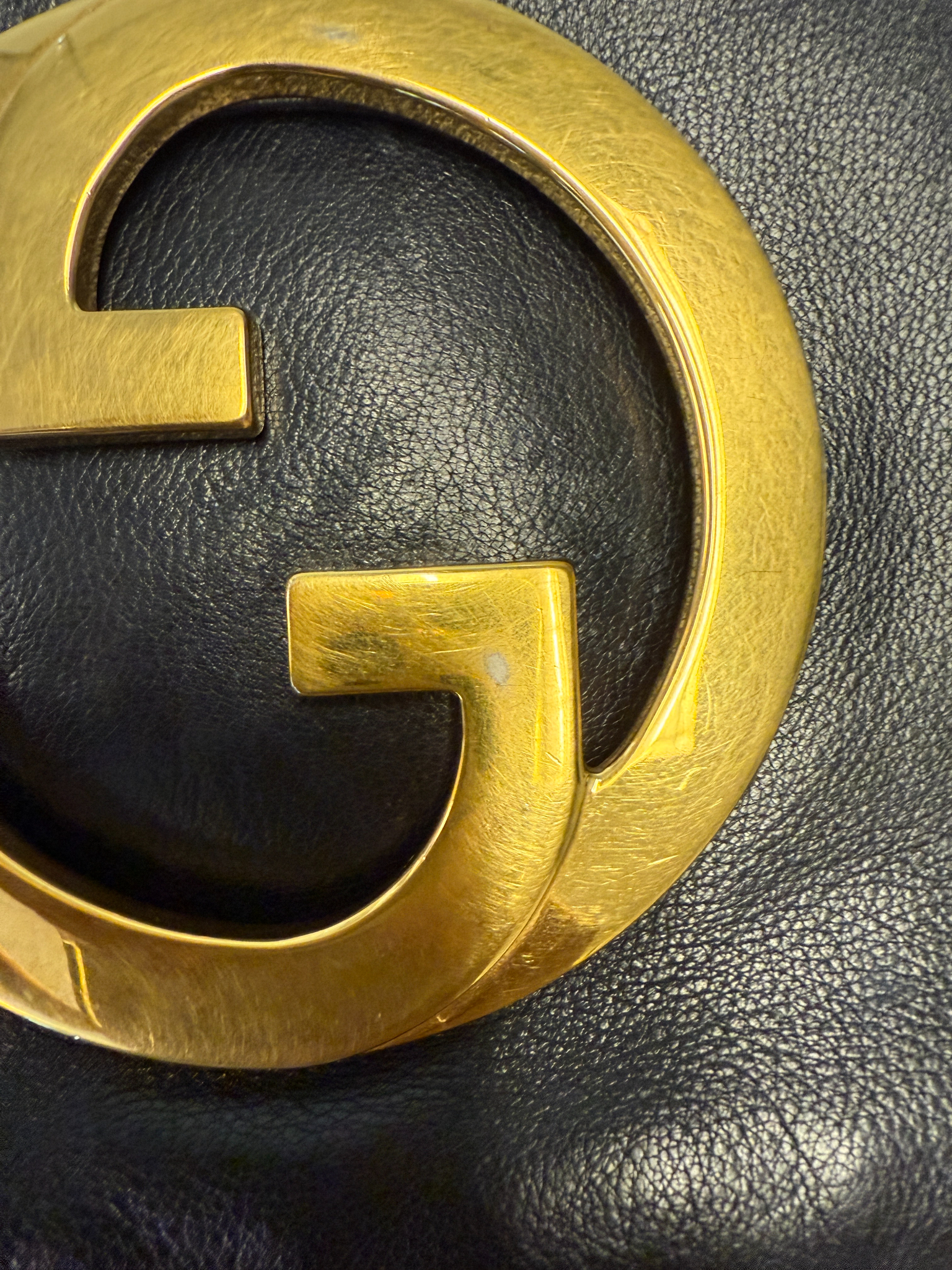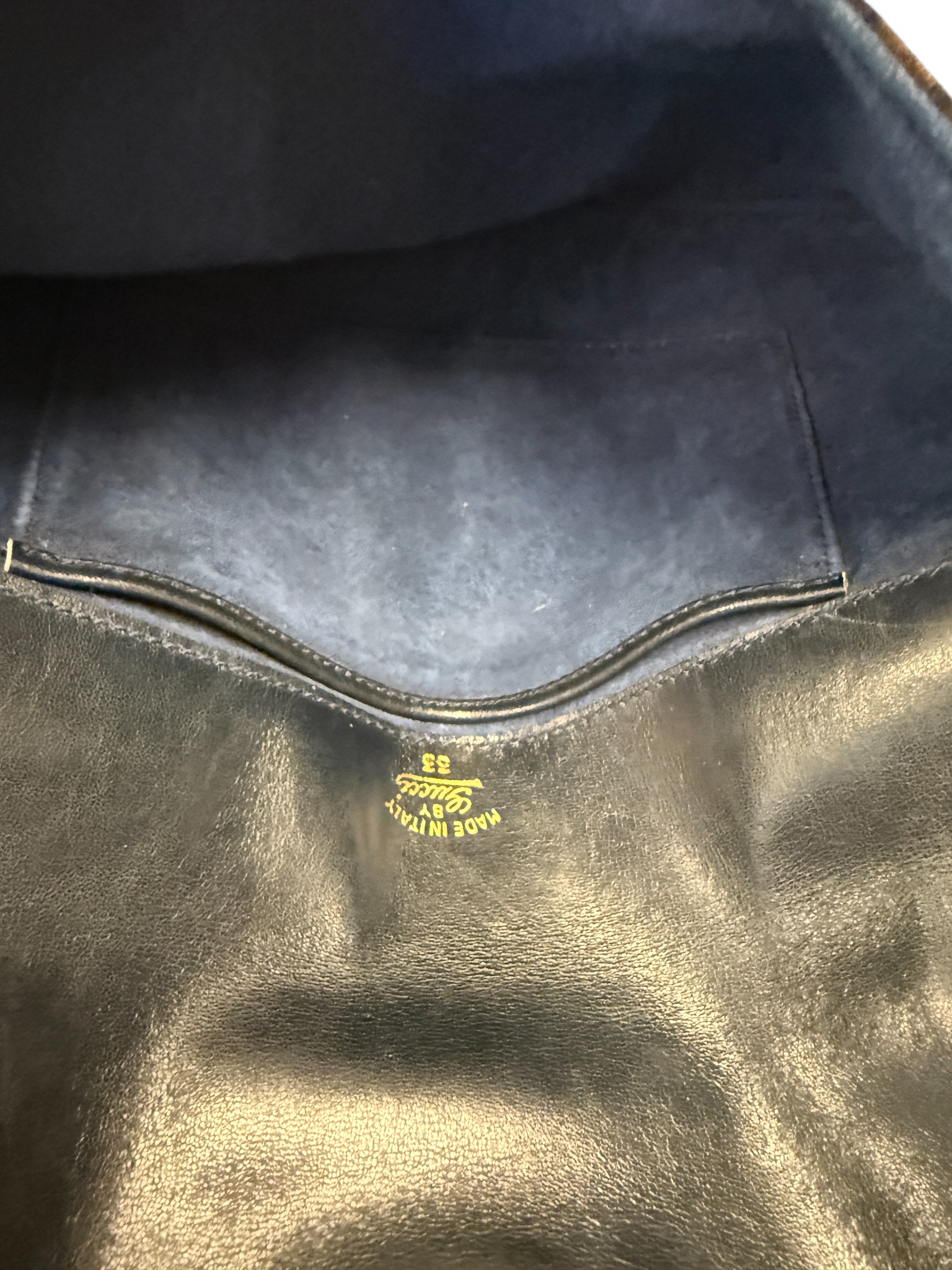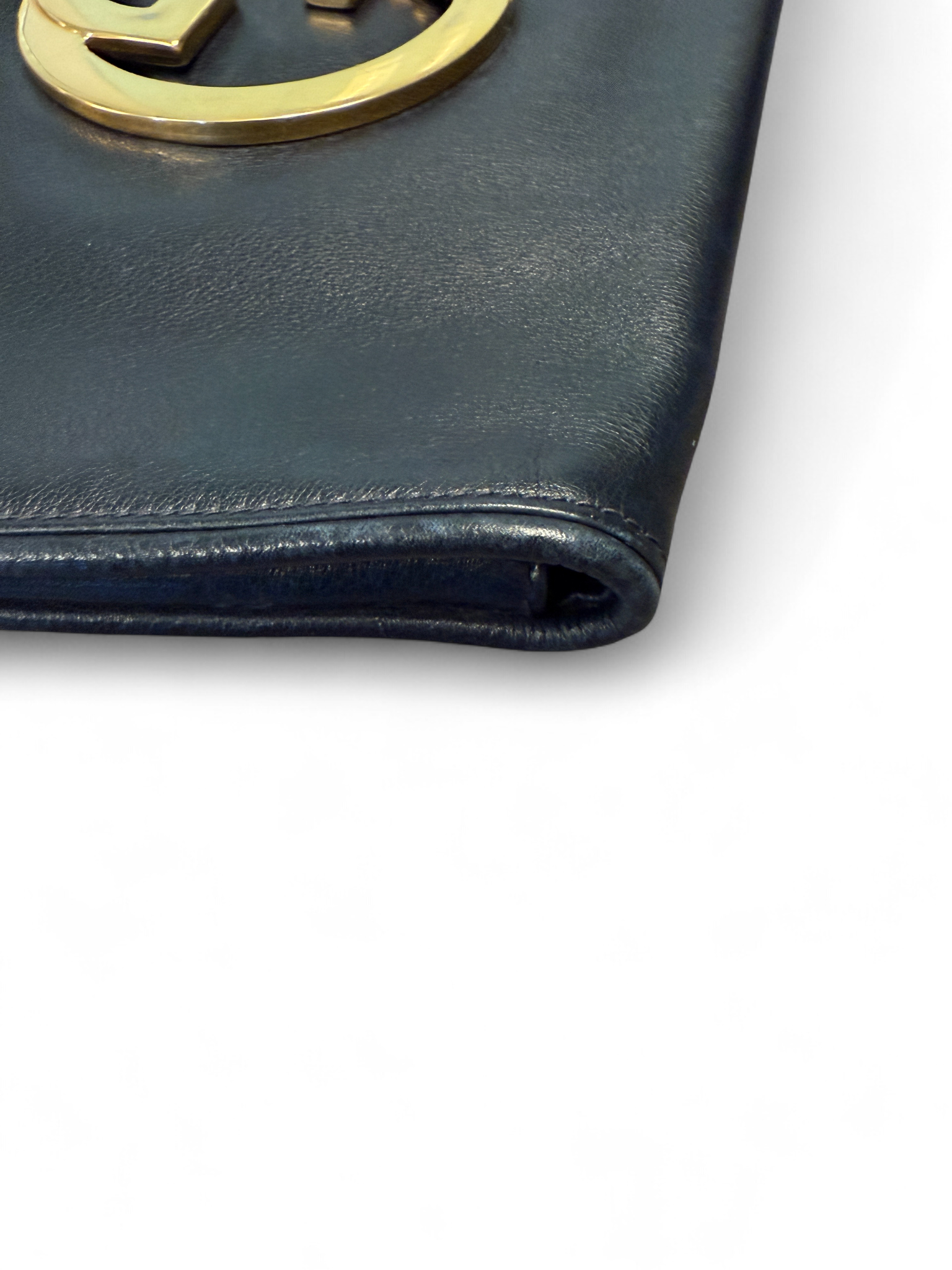 From this 70s this buttery soft leather clutch is outstanding. Deep navy color is standout and hardware is in very good condition. Please see pictures of the minor wear on the leather trims.  Interior leather is in good condition with some scratches. Minor surface scratch on the GG hardware but nothing severe, see picture. Blue suede makes this a hard to find and very coveted piece.