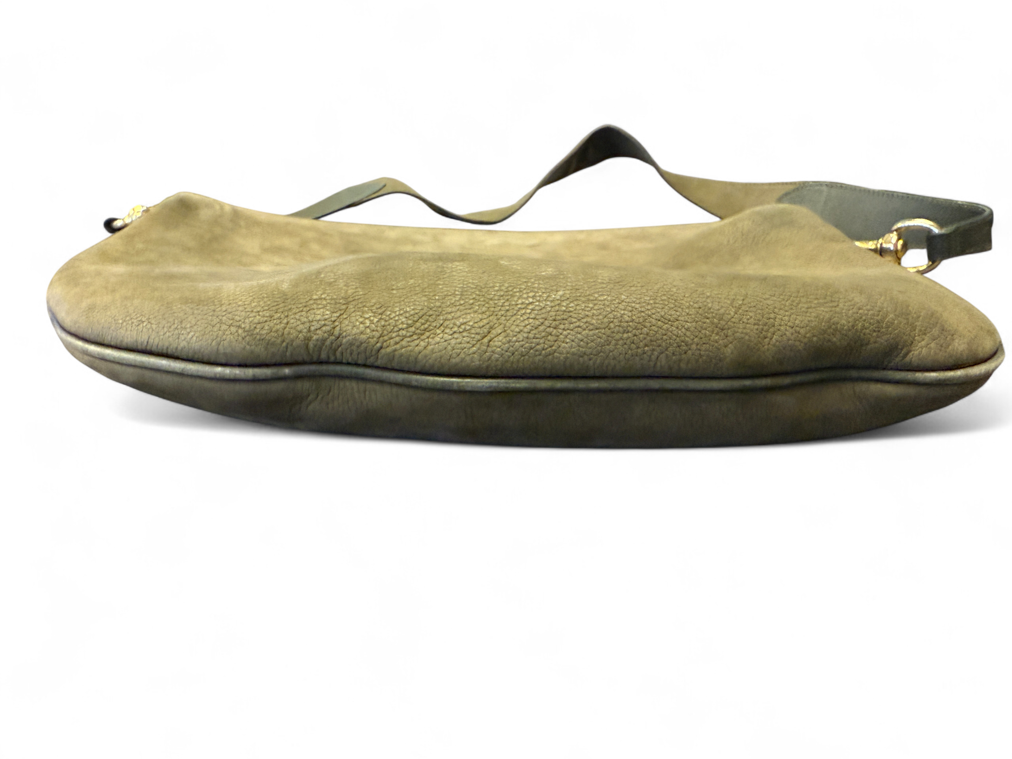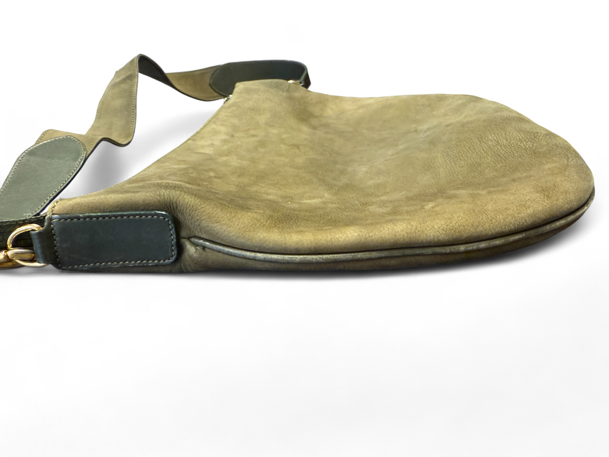 80s luxury at its finest, the super soft nubuck suede leather is in great condition. Green hue is rich. Holds all your essentials and more, this is the perfect bag for daily use. This is the original shoulder strap but it is removable if you want to add different one for your convenience. Gold tone hardware.